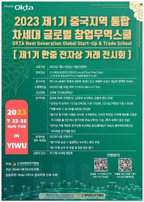세계한인무역협회(World-OKTA)가 주최하고, 중국에 있는 월드옥타 지회들이 공동 주관하는 ‘중국지역 통합 차세대 글로벌 창업무역스쿨’이 오는 7월 23일부터 25일까지 중국 이우시에 있는 크라운 플라자 엑스포에서 열린다.