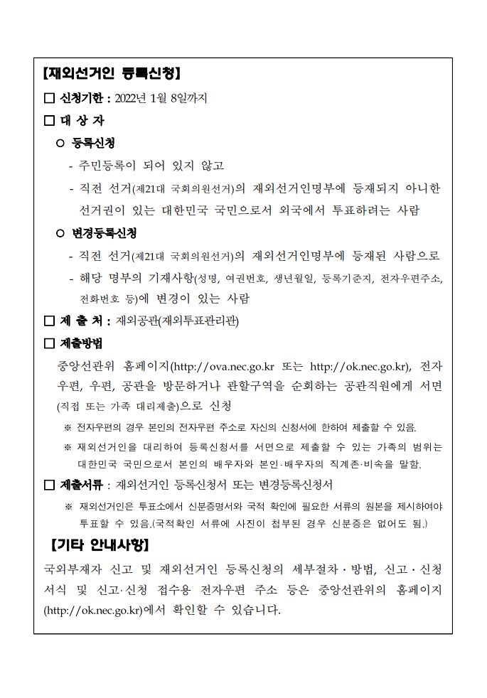 제20대 대통령선거 국외부재자 신고 2021-10-12 이우정보 상해영사관 안내문제20대 대통령 선거 국외부재자 신고첨부파일 참고바랍니다. 글쓴이 : 상해영사관 이우가이드는 이우생활과 한중 무역에 꼭 필요한 정보를 제공합니다. << 이전 해외 예방접종완료자 확인서 발급 계획 다음 >> 절강성 한상회 친선교류 골프대회
